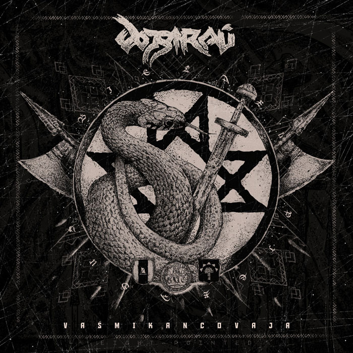 Vojstrau - Vasmikancovaja. Vaśmikancovaja (zorka)in translation is "eight pointed star", octagram.November 18, 2016. All music and lyrics by Aleh Zielankievič. Session musicians:Vitautas Kashkurevich - guitars recording. Raman Sałonikaŭ - acoustic guitar recording. Artur Matveenko - some help with synths on track 6. Theodor Borovski - drums. Production: Mixed and mastered by Gennady Kharitonov at BR Studio. Co-produced by Vladimir Lehtinen. Track №6 (Paŭstań) is re-composed and re-recorded song from Wartha album "Paŭstań" released by Stygian Crypt productions in 2013. Artwork by Aleh Zielankievič
